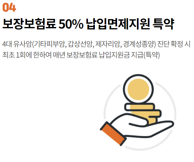 특별약관의 보험기간 중 약관에서 정한 "4대유사암"으로 진단확정된 경우, 최초 1회에 한하여 보장보험료 납입지원기간 동안 매년 보험금 지급사유 발생일에 아래의 금액을 보장보험료 납입지원금으로 지급 - 지급금액(1회 지급액) : "납입지원대상 보장보험료"의 50% x 당해연도 납입지원 개월수 - 지급방법 : 보장보험료 납입지원기간동안 매년 보험금 지급사유 발생일에 지급금액(1회 지급액) 확정지급 ▷약관에서 정한 "4대유사암"은 "기타피부암", "갑상선암", "제자리암" 및 "경계성종양"을 말하며, 질병분류기준은 제8차 개정 한국표준질병·사인분류에 따릅니다. ※ 이 특별약관에서 정한 "보장보험료 납입지원기간", "납입지원대상 보장보험료" 및 "당해연도 납입지원 개월수"에 대한 자세한 사항은 약관을 참조하시기 바랍니다. |
