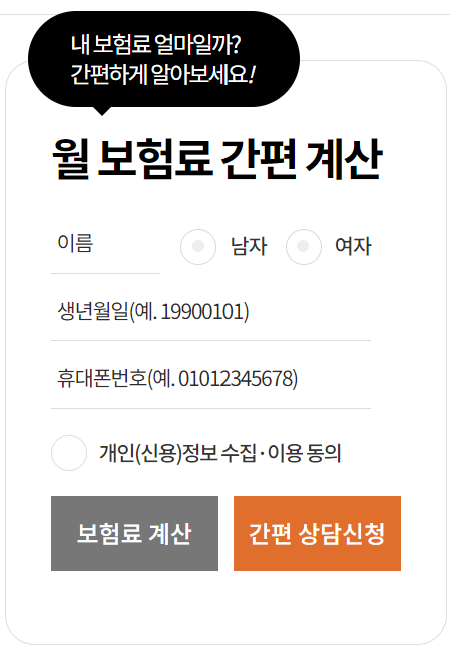 우선 이름 , 성별, 생년월일, 휴대폰 번호를 순서대로 입력 후 개인정보 수집 이용에 동의 후 보험료 계산하기를 클릭합니다.바로 다음과 같이 보험료가 계산됩니다.