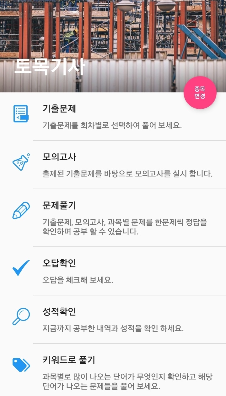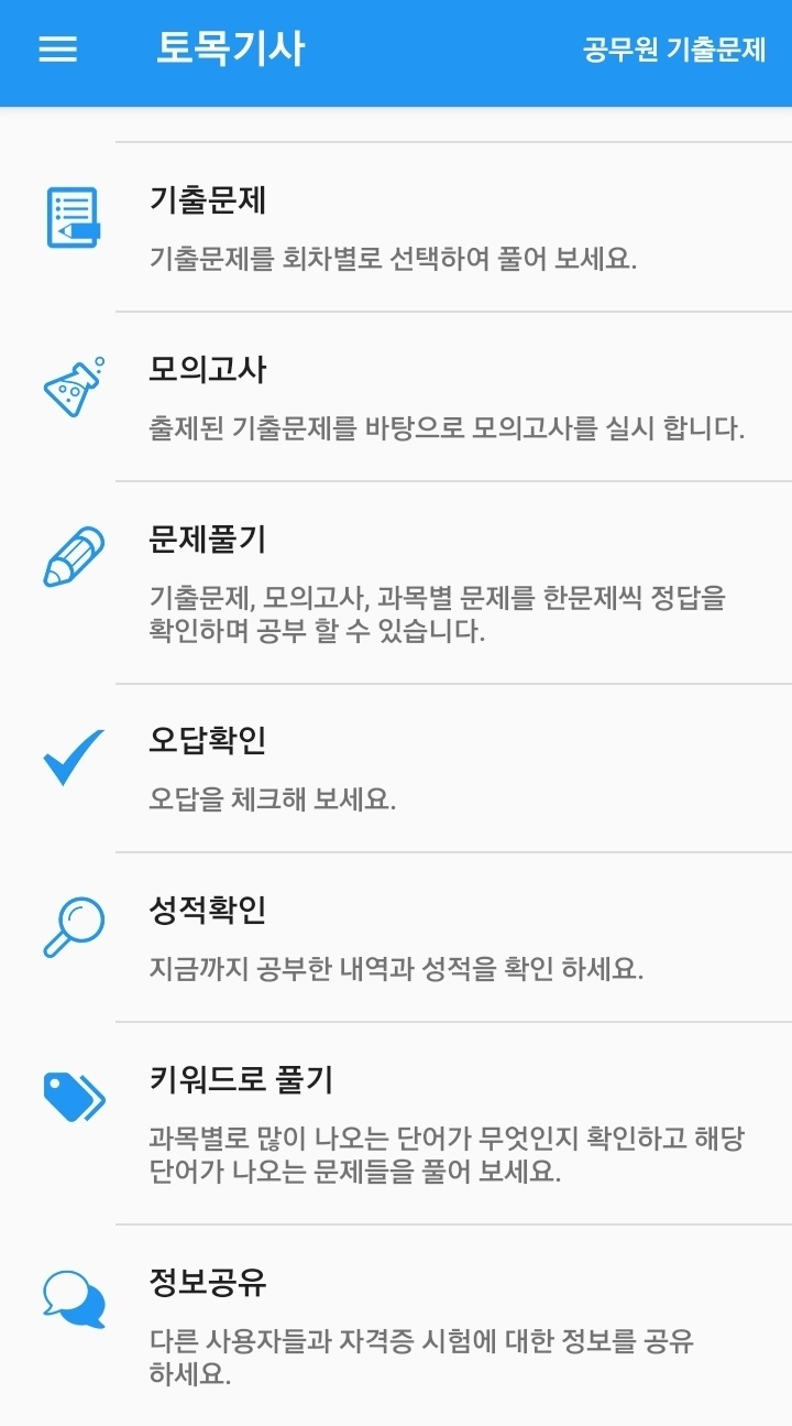 어플을 이용하여 연도별 기출문제와 모의고사 여러가지 문제 풀기가 가능합니다. 기출문제를 많이 풀어야 시험 합격 확률이 올라갑니다.