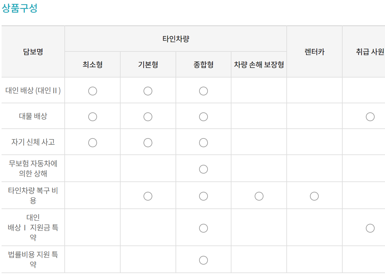 - 자동차보험은 법적으로 의무적으로 가입해야 하는 대인배상책임보험 외에는 선택적으로 가입할 수 있습니다. 따라서, 본인의 운전 습관과 자차의 상태에 따라 필요한 보험만 가입하시면 됩니다.