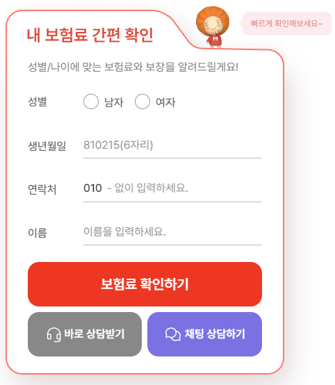 성별, 생년월일, 연락처, 이름 입력 후 보험료 확인하기를 클릭합니다.