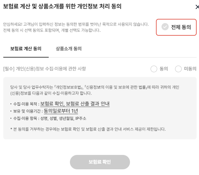 보험료 계산을 위한 필수 동의 체크 후 상품 소개는 선택 동의이기 때문에 미동의하셔도 됩니다.