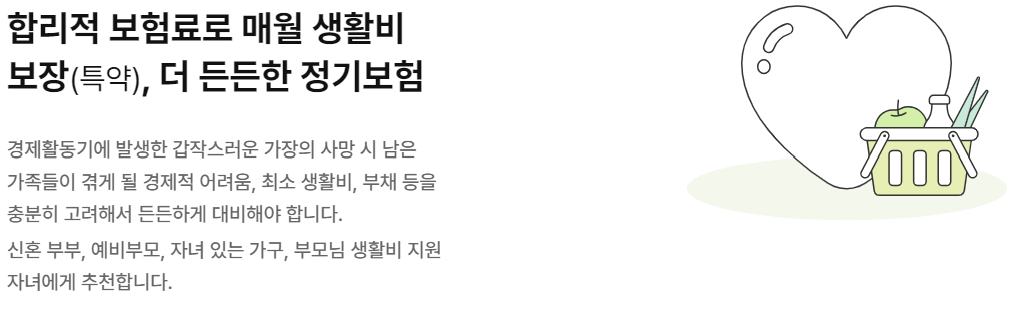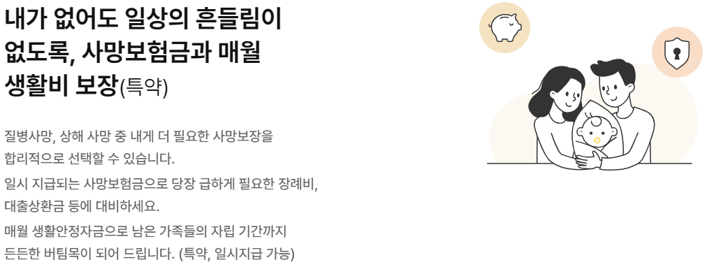 | 갱신형 질병사망 생활안정자금 (2년) | 질병으로 인하여 사망한 경우 최초 1회한 매월 2년간 생활안정자금 확정 지급 (가입 후 1년 미만 50% 지급) |