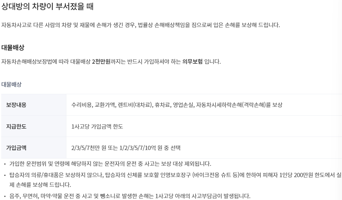 |보장 범위|민사적 책임(대인, 대물)|형사적 책임(교통사고 처리 지원금, 벌금, 변호사 선임비 등)|