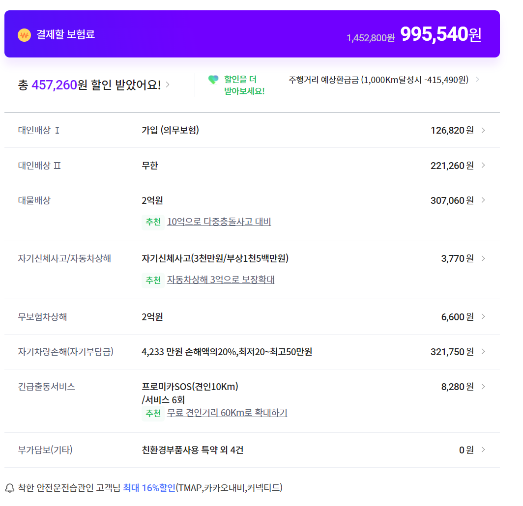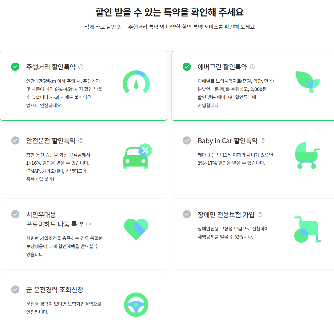 할인 받을 수 있는 특약을 체크합니다. 다음을 누르면 보험료가 계산됩니다.