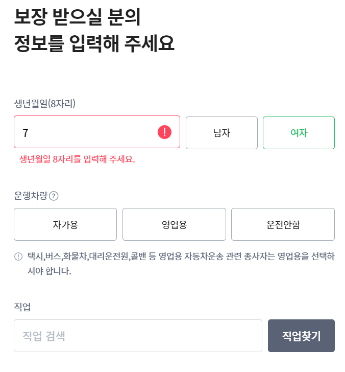 보험료 계산방법은 정말 간단합니다. 우선 생년월일, 성별, 차량 운행 정보, 직업정보 입력 후 보험료 계산하기를 클릭하면 보험료가 바로 계산됩니다.