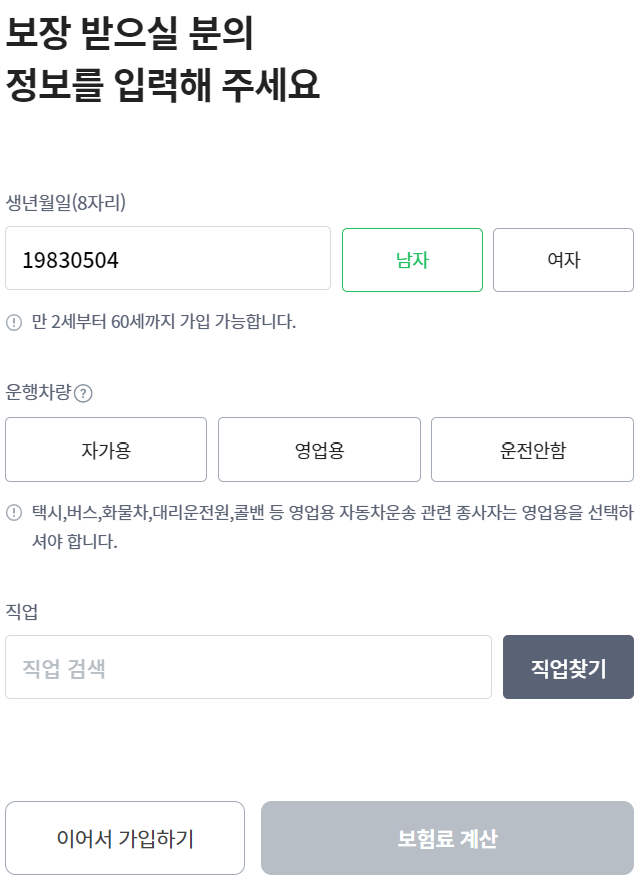 생년월일 성별 차량 운행 및 직업 정보 입력 후 보험료 계산을 누르면 바로 다음과 같이 보험료가 계산됩니다.