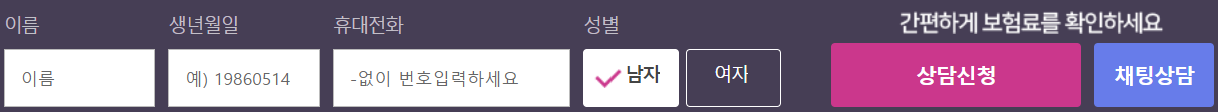 보험료 계산방법은 이름, 생년월일, 휴대폰번호, 성별 입력 후 채팅 또는 전화상담 신청이 가능합니다.