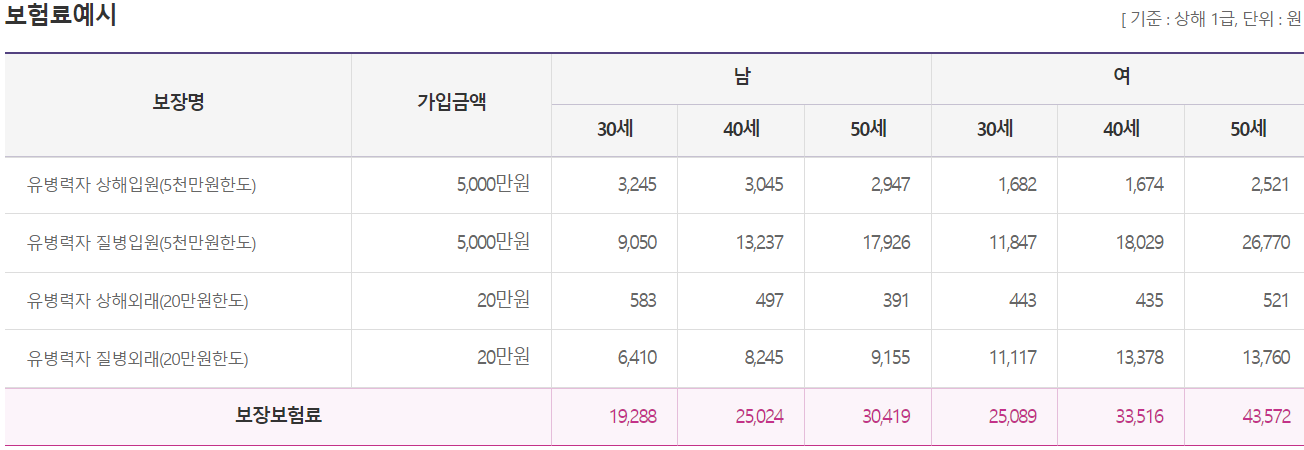 - 주2) 상기 예시표는 가입나이, 직업 등에 따라 달라질 수 있습니다.