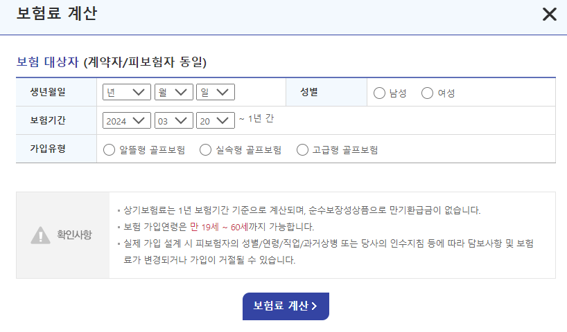 먼저 생년월일, 성별, 보험기간, 가입유형 선택 후 보험료 계산을 클릭합니다.