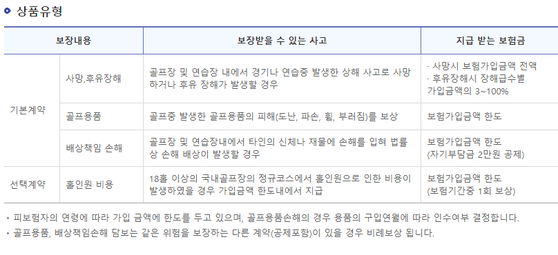 골프중 몸에 상해사망이나 후유장애가 생기면 보험 가입금액에 따라 보장을 해줍니다.