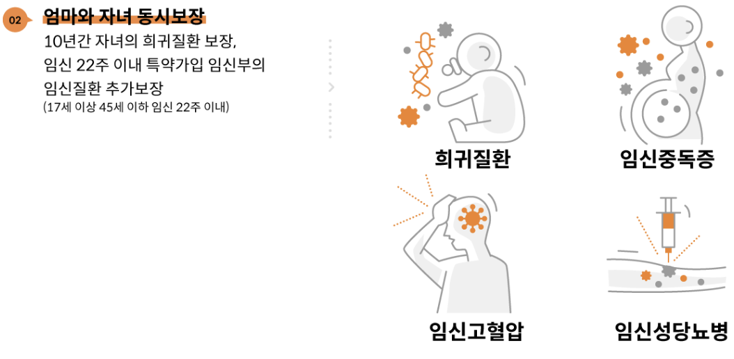 이 보험은 임신 중 발생할 수 있는 다양한 질환과 태아의 희귀질환에 대한 보장을 제공합니다. 가입 대상은 17세에서 45세 사이의 임신 22주 이내의 임신부입니다. 보험료는 우체국이 전액 지원하므로 가입자에게는 무료입니다.