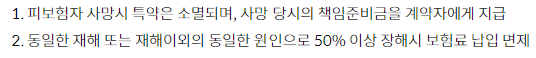 - 보험금 지급사유가 더 이상 발생할 수 없거나 피보험자 사망시 특약은 소멸되며, 보험금 지급사유가 더 이상 발생할 수 없을 당시의 책임준비금 또는 사망 당시의 책임준비금을 계약자에게 지급