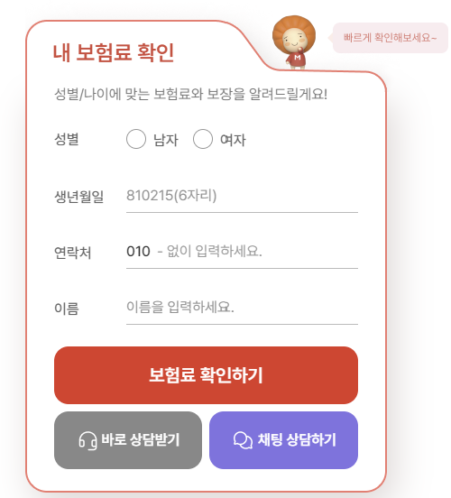 보험료는 사람마다 나이, 보장금액 등 여러 조건에 따라 달라지므로 직접 조회해보시면서 보험료를 확인해보시기 바랍니다.
