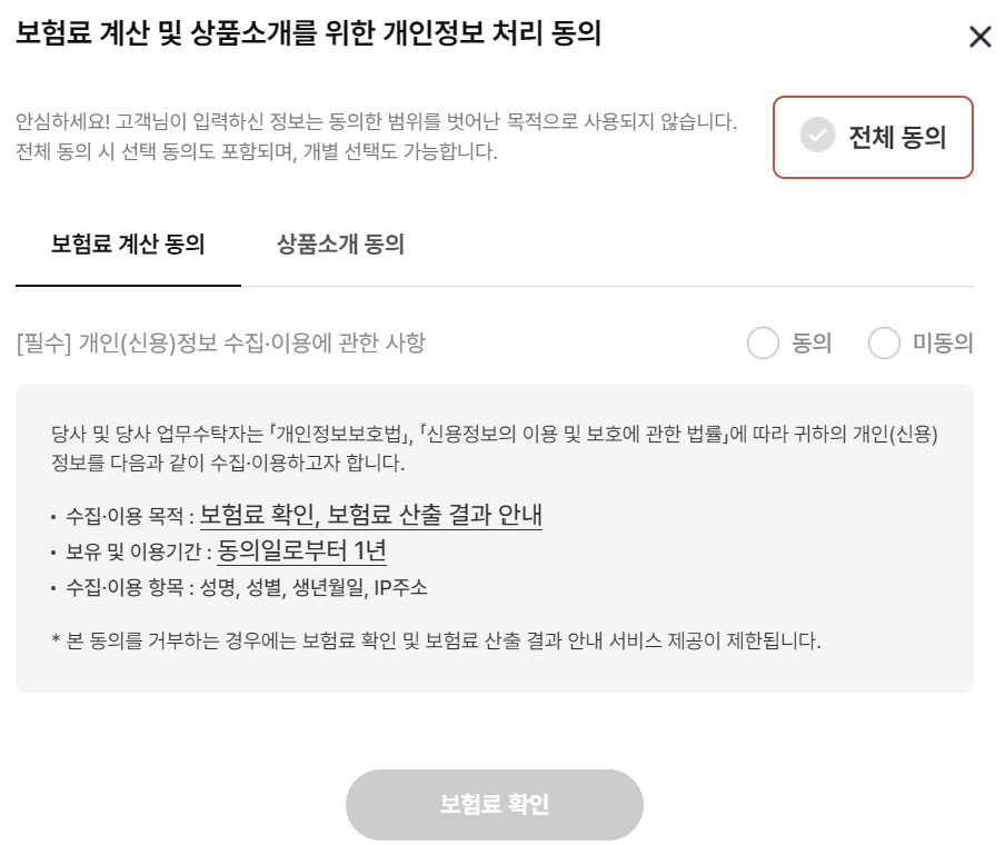 보험료 계산을 위한 개인정보 수집에 동의해주시고 상품소개는 선택 사항이라 미동의 하셔도 됩니다.