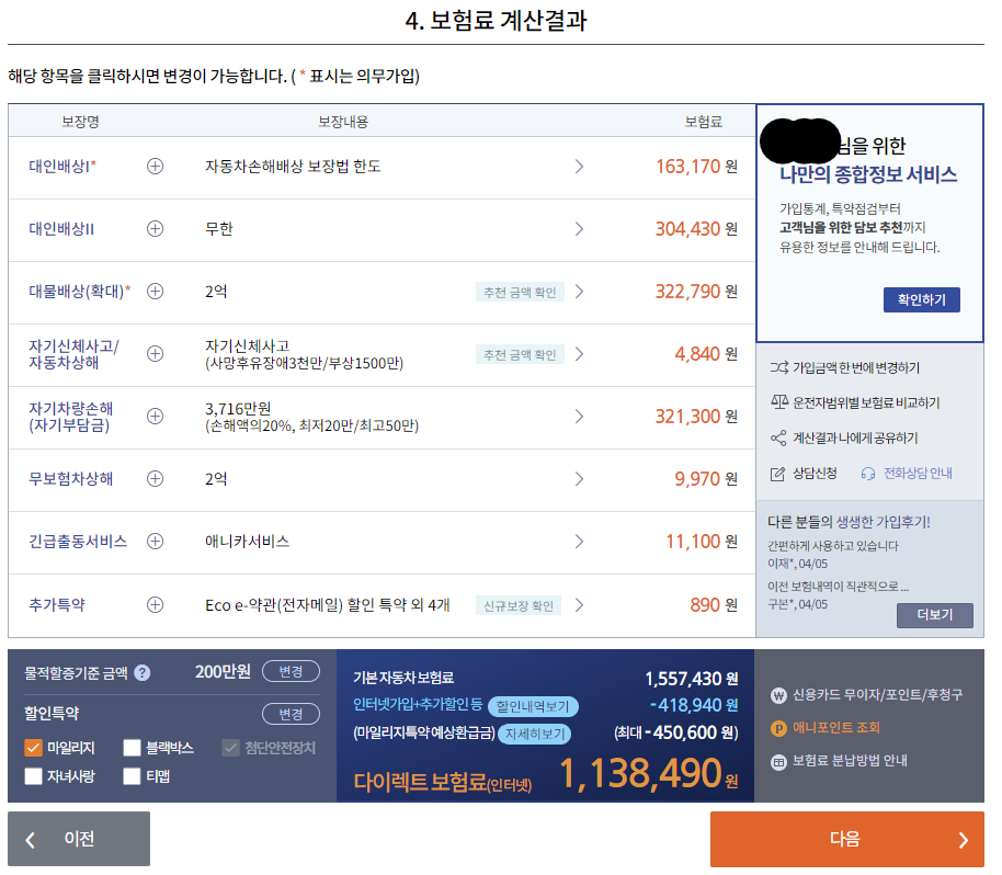 운전자 정보를 입력합니다. 그럼 다음과 같이 보험료가 계산됩니다.
