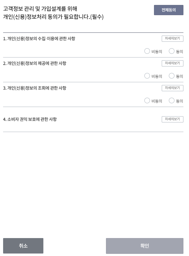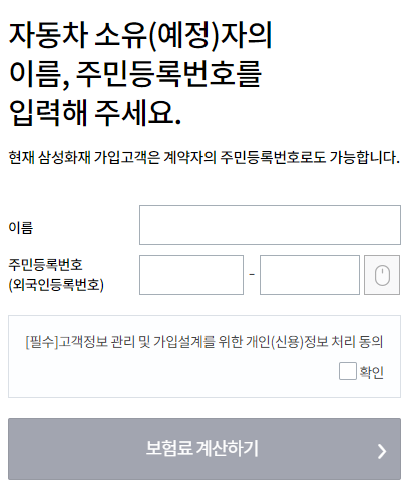 우선 이름 주민번호 입력 후 필수 정보 동의 후 보험료 계산하기를 클릭합니다.