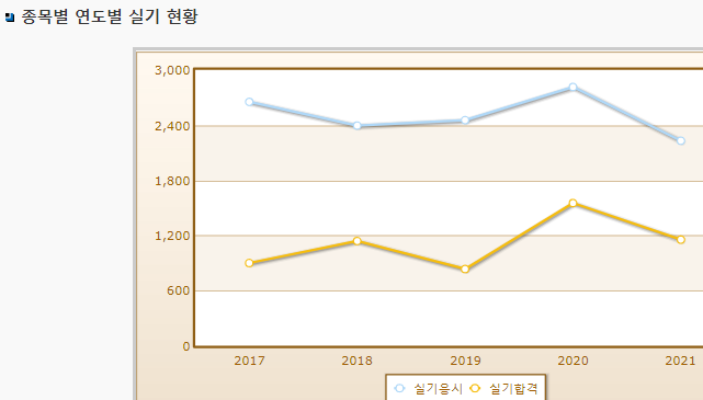 실기시험 연도별 합격률이며 2021년 기준 실기시험 응시자수는 2,230명으로 그 중 합격자는 1,154명입니다.