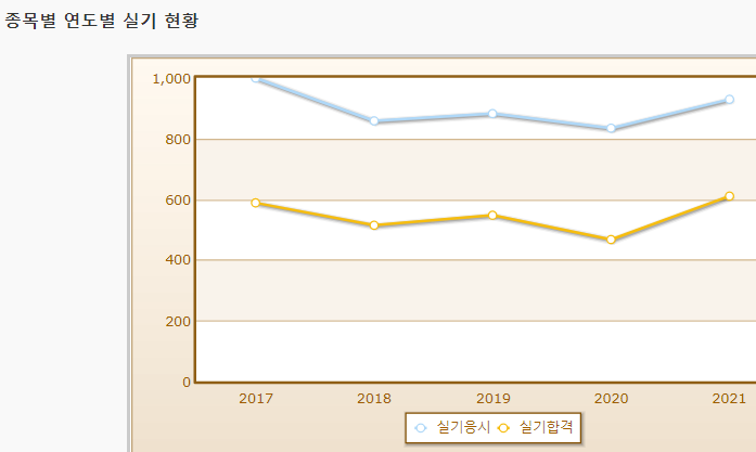 연도별 실기시험 합격률이며 2021년 기준 실기시험 응시자 수는 929명으로 그 중 합격자는 610명입니다.