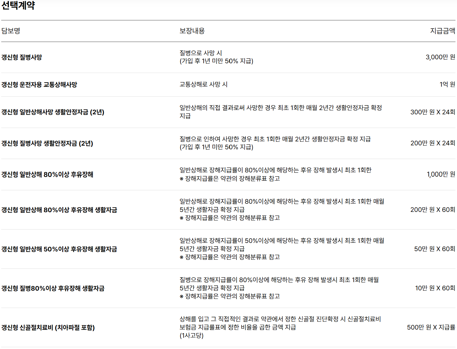 | 보장범위 | 사망, 재해사망, 질병사망, 장해, 암진단 등 선택 가능 |