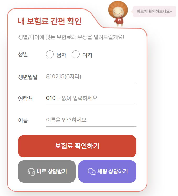 성별 생년월일 연락처 이름 우선 적으신다음 보험료 확인하기를 클릭합니다.