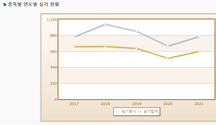 2021년 기준 필기시험 응시자는 1,473명이며 그중 합격자는 673명이고 실기시험 응시자는 868명이며 그 중 합격자는 661명입니다. 실기시험보다 오히려 필기시험이 어려운 자격증 중 하나로 필기시험 기출문제를 많이 풀어 필기시험 준비를 철저히 하셔야 합니다.