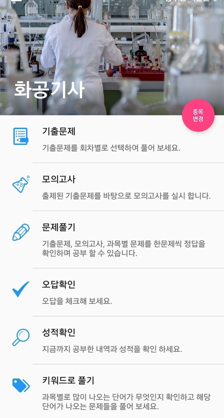 어플을 이용하여 기출문제와 모의고사를 풀 수 있고 화공기사 시험 준비생들과 자격증 시험에 대한 정보도 공유할 수 있습니다.