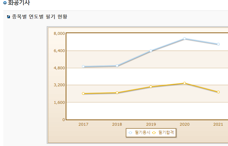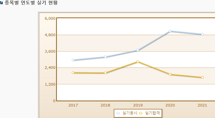 실기시험도 높지 않은 합격률을 보이는데 필기는 낮은 합격률을 보입니다.