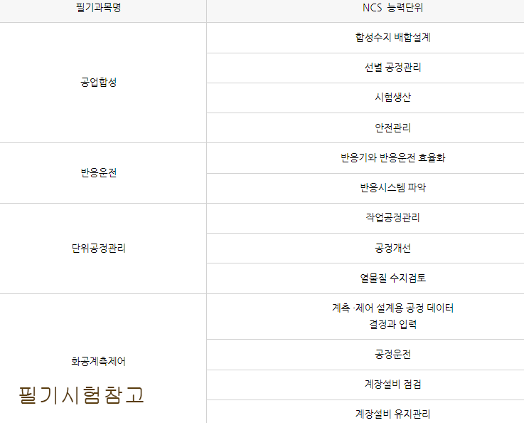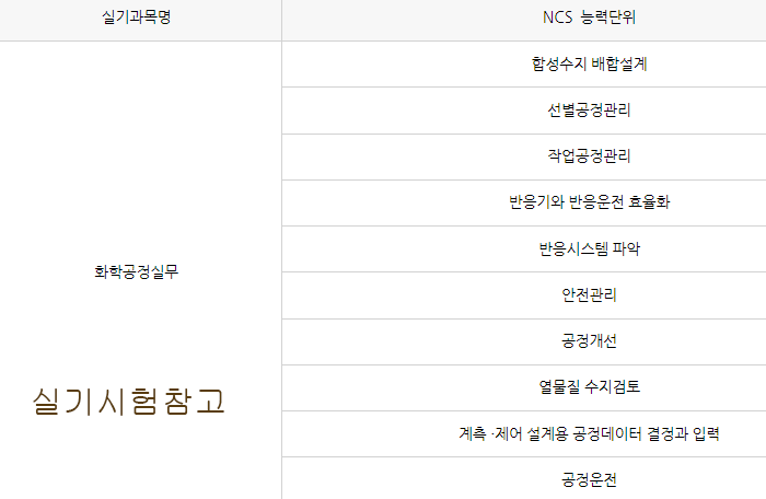화공기사 필기시험 과목은 2022년 1월 1일부터 NCS를 기반으로 과목이 개편되었습니다. 기존 5과목에서 4과목으로 변경되었으며, 필기과목은 공업 합성, 반응 운전, 화공 계측제어, 단위공정관리 총 4과목이며, 객관식 4지 택일형으로 과목당 20문제가 출제되고, 시험시간은 30분씩 총 80문제를 120분 동안 시험을 보게 됩니다. 합격기준은 과목당 40점 이상, 전과목 만점 기준 평균 60점 이상을 맞아야 합격합니다.