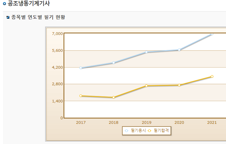 이 자격증은 공사,공기업 기계 직렬 필수 자격증으로 냉동 고압가스업 체나 공조냉동 설비 관련 업체, 냉난방 및 냉동장치 제조업체 등 다양한 분야로 진출이 가능하며, 공기업 채용 시 가산점을 받을 수 있는 자격증입니다. 안전관리 규정의 시행에 따라 냉동과 공기조화 설비의 시공, 보수, 유지 업무에 대한 관심이 최근 많이 증가하면서 응시 인원이 매년 증가하고 있습니다.
