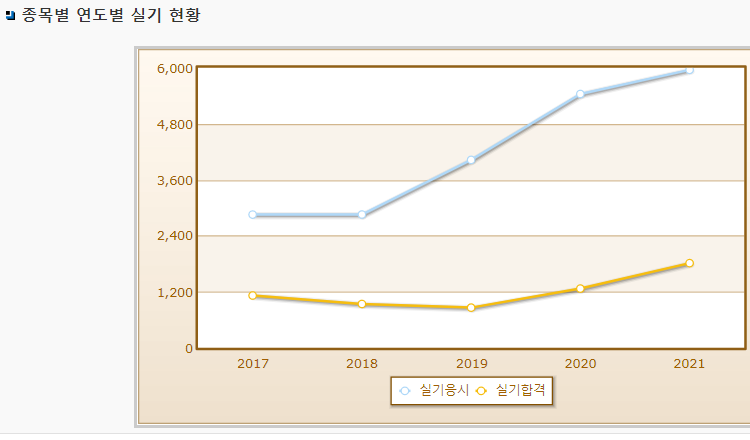 실기시험의 경우 2021년 기준 응시자는 5,955명으로 그중 합격자는 1,813명입니다.