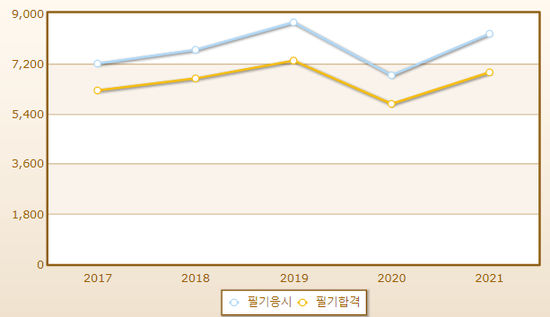 연도별 필기시험 합격률이며 2021년 기준 응시자 수는 8,265명으로 그 중 합격자는 6,877명입니다.