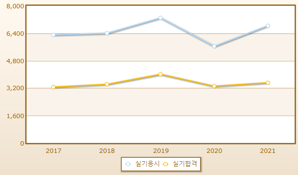 연도별 실기시험 합격률이며 2021년 기준 응시자 수는 6,838명으로 그 중 합격자는 3,515명입니다.
