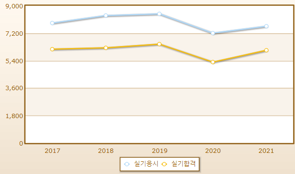 연도별 실기시험 합격률이며 2021년 기준 응시자 수는 7,659명으로 그 중 합격자는 6,083명입니다.