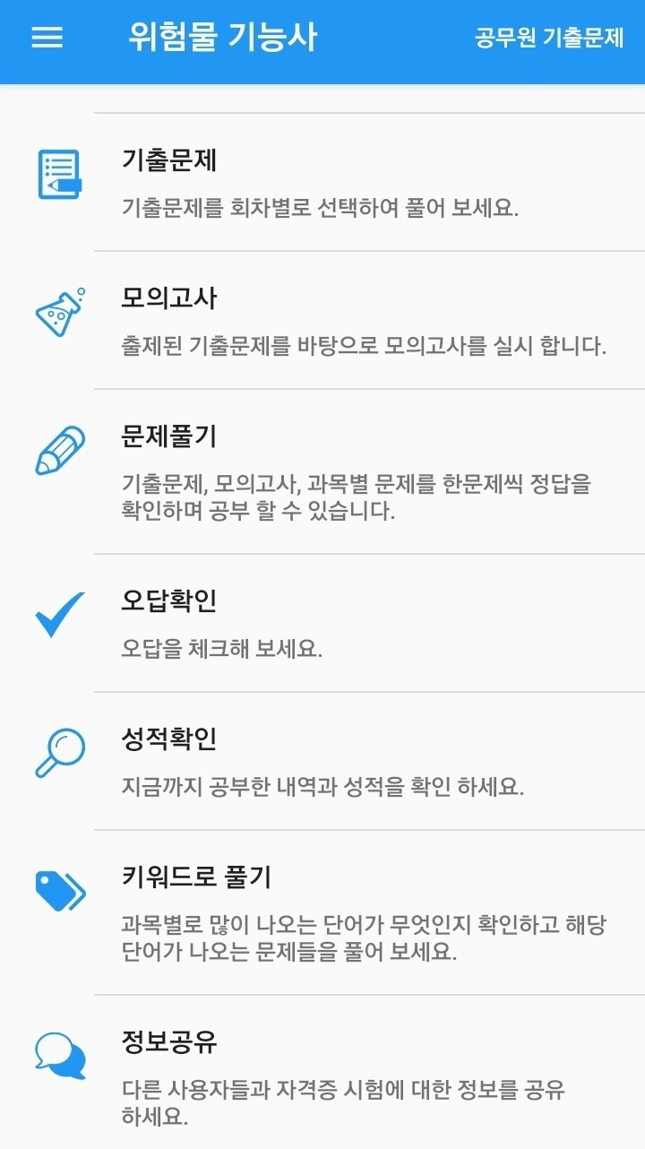 어플을 이용하여 연도별 기출문제와 모의고사 각종 문제를 풀 수 있으며 오답 확인도 가능합니다. 필기시험 합격률이 낮은 만큼 문제를 많이 풀어 철저히 대비해서 1년에 4번 있는 시험이니 한 번에 합격하시는 게 좋습니다.