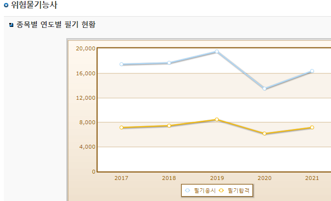연도별 위험물기능사 필기 합격률입니다. 2021년 기준 응시자 수는 16,322명으로 그중 합격자는 7,150명입니다.
