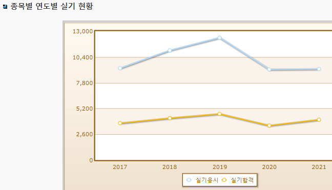 연도별 위험물기능사 실기 합격률입니다. 2021년 기준 응시자 수는 9,188명으로 그 중 합격자는 4,070명입니다.
