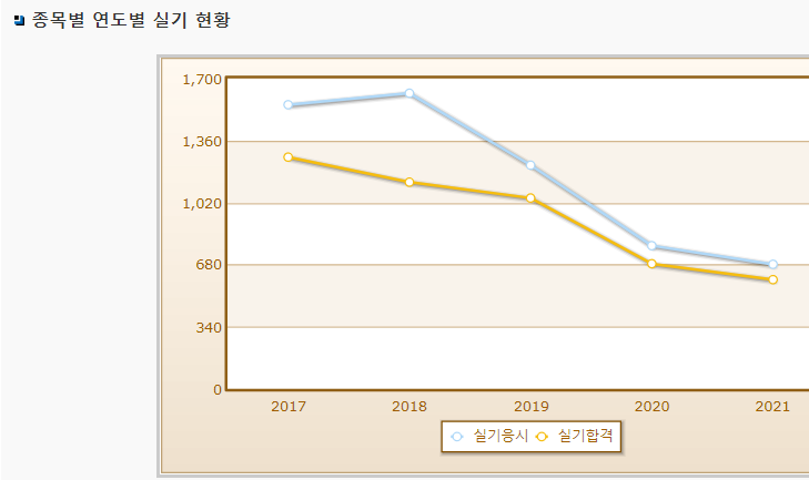 실기시험의 합격률은 엄청 높은데 반해 필기시험 합격률은 매우 낮습니다. 그러므로 필기시험 대비를 철저히 해야 합니다. 코로나로 인해 점차 줄다가 다시 응시자 수가 늘어날 것으로 전망됩니다.
