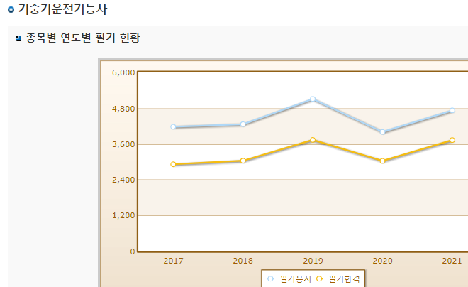 연도별 필기시험 합격률이며 2021년 기준 필기시험 응시자 수는 4,724명으로 그 중 합격자는 3,727명입니다.